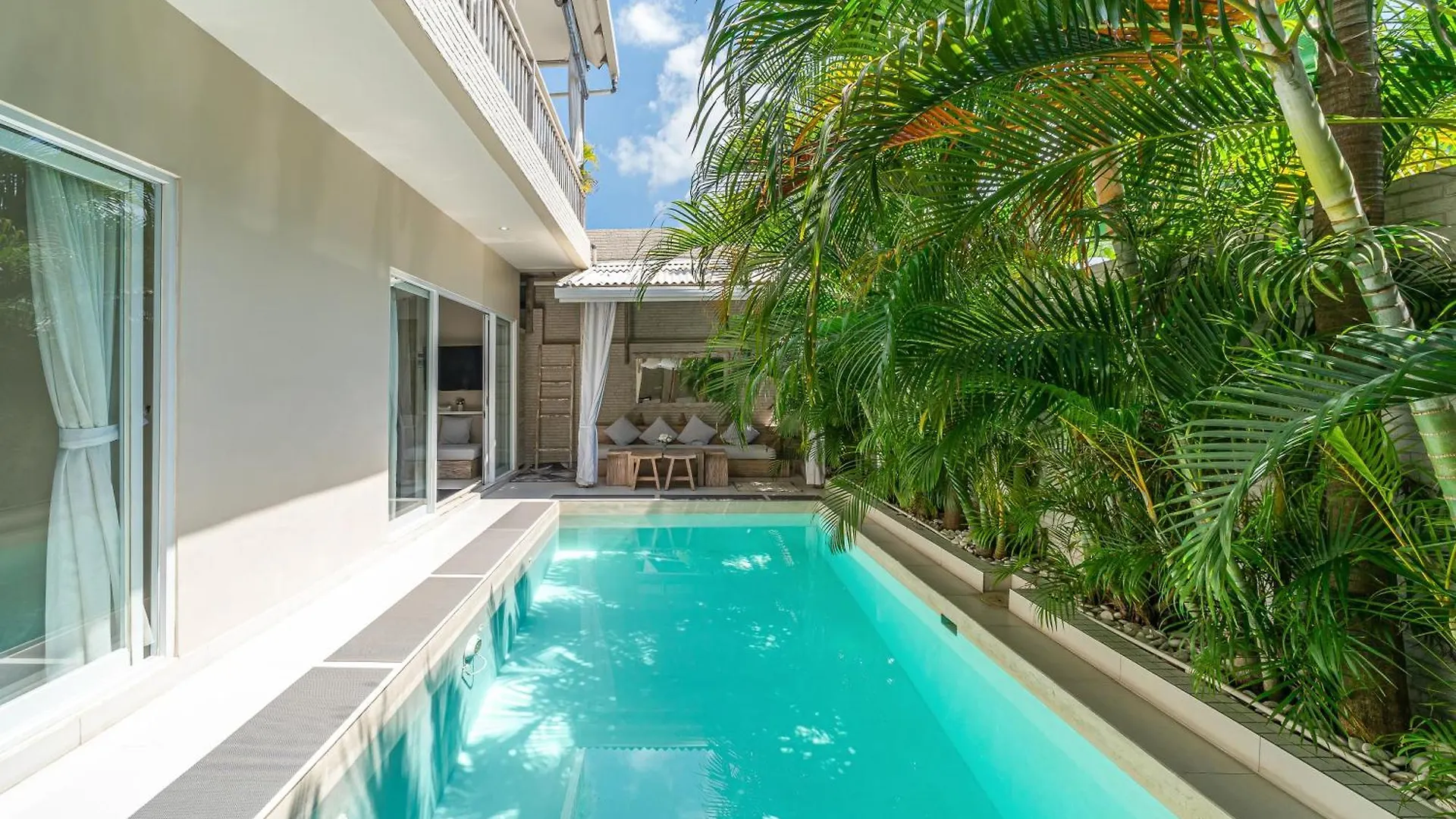 Terraço oferece vistas para a piscina. Villa Bali Om Center - Best Location, Beautiful Villa Near The Beach dispõe de uma casa de banho com casa de banho separada e chuveiro. Além disso, os hóspedes podem desfrutar da conveniência de secador de cabelo, roupões e lençóis de banho.